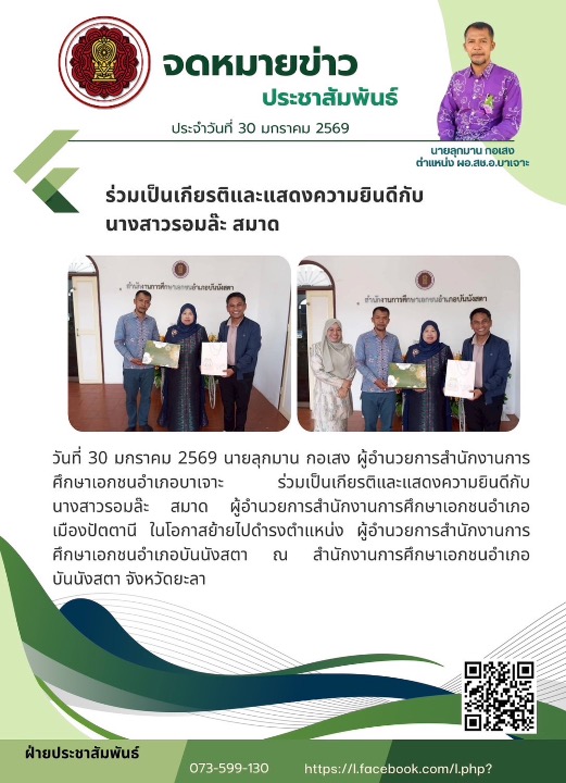 วันที่ 30 มกราคม 2569 นายลุกมาน กอเสง ผู้อำนวยการสำนักงานการศึกษาเอกชนอำเภอบาเจาะ ร่วมเป็นเกียรติและแสดงความยินดีกับ นางสาวรอมล๊ะ สมาด ผู้อำนวยการสำนักงานการศึกษาเอกชนอำเภอเมืองปัตตานี ในโอกาสย้ายไปดำรงตำแหน่ง ผู้อำนวยการสำนักงานการศึกษาเอกชนอำเภอบันนังสตา ณ สำนักงานการศึกษาเอกชนอำเภอบันนังสตา จังหวัดยะลา