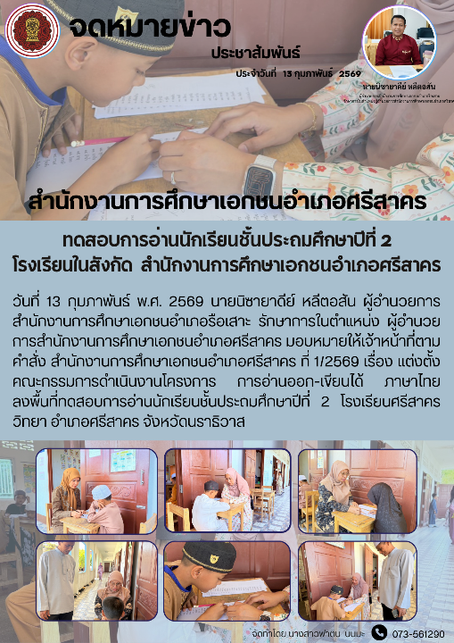 วันที่ 13 กุมภาพันธ์ พ.ศ. 2569 นายนิซายาดีย์ หลีตอสัน ผู้อำนวยการสำนักงานการศึกษาเอกชนอำเภอรือเสาะ รักษาการในตำแหน่ง ผู้อำนวยการสำนักงานการศึกษาเอกชนอำเภอศรีสาคร มอบหมายให้เจ้าหน้าที่ตามคำสั่ง สำนักงานการศึกษาเอกชนอำเภอศรีสาคร ที่ 1/2569 เรื่อง เเต่งตั้งคณะกรรมการดำเนินงานโครงการ การอ่านออก-เขียนได้ ภาษาไทย ลงพื้นที่ทดสอบการอ่านนักเรียนชั้นประถมศึกษาปีที่ 2 โรงเรียนศรีสาครวิทยา อำเภอศรีสาคร จังหวัดนราธิวาส