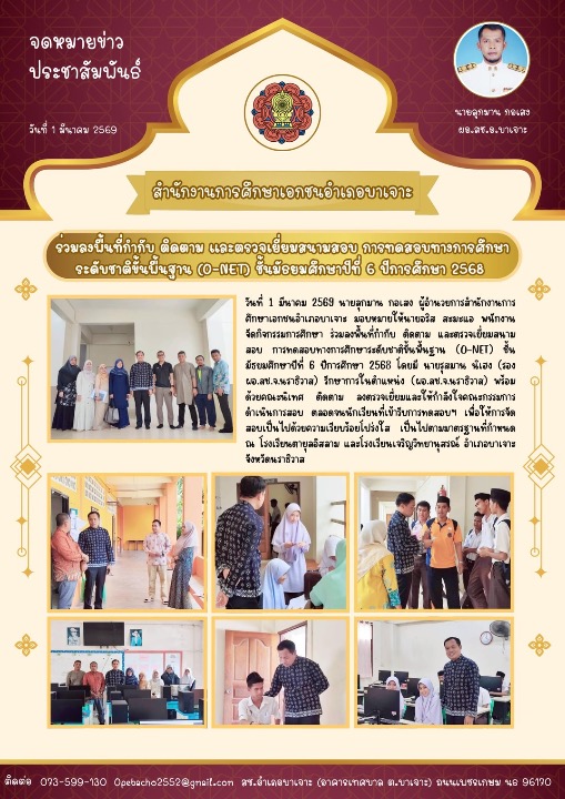 วันที่ 1 มีนาคม 2569 นายลุกมาน กอเสง ผู้อำนวยการสำนักงานการศึกษาเอกชนอำเภอบาเจาะ มอบหมายให้นายอริส สะมะแอ พนักงานจัดกิจกรรมการศึกษา ร่วมลงพื้นที่กำกับ ติดตาม และตรวจเยี่ยมสนามสอบ การทดสอบทางการศึกษาระดับชาติขั้นพื้นฐาน (O-NET) ชั้นมัธยมศึกษาปีที่ 6 ปีการศึกษา 2568 โดยมี นายรุสมาน นิเฮง (รอง ผอ.สช.จ.นราธิวาส) รักษาการในตำแหน่ง (ผอ.สช.จ.นราธิวาส) พร้อมด้วยคณะนิเทศ ติดตาม ลงตรวจเยี่ยมและให้กำลังใจคณะกรรมการดำเนินการสอบ ตลอดจนนักเรียนที่เข้ารับการทดสอบฯ เพื่อให้การจัดสอบเป็นไปด้วยความเรียบร้อยโปร่งใส เป็นไปตามมาตรฐานที่กำหนด ณ โรงเรียนตายุลอิสลาม และโรงเรียนเจริญวิทยานุสรณ์ อำเภอบาเจาะ จังหวัดนราธิวาส