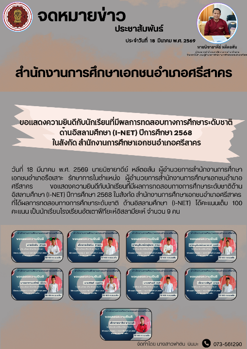 วันที่ 18 มีนาคม พ.ศ. 2569 นายนิซายาดีย์ หลีตอสัน ผู้อำนวยการสำนักงานการศึกษาเอกชนอำเภอรือเสาะ รักษาการในตำแหน่ง ผู้อำนวยการสำนักงานการศึกษาเอกชนอำเภอศรีสาคร ขอเเสดงความยินดีกับนักเรียนที่มีผลการทดสอบทางการศึกษาระดับชาติด้านอิสลามศึกษา (I-NET) ปีการศึกษา 2568 ในสังกัด สำนักงานการศึกษาเอกชนอำเภอศรีสาคร ที่ได้ผลการทดสอบทางการศึกษาระดับชาติ ด้านอิสลามศึกษา (I-NET) ได้คะเเนนเต็ม 100 คะเเนน เป็นนักเรียนโรงเรียนอัตเตาฟีกียะห์อิสลามียะห์ จำนวน 9 คน