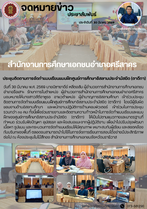 วันที่ 30 มีนาคม พ.ศ. 2569 นายนิซายาดีย์ หลีตอสัน ผู้อำนวยการสำนักงานการศึกษาเอกชนอำเภอรือเสาะ รักษาการในตำแหน่ง ผู้อำนวยการสำนักงานการศึกษาเอกชนอำเภอศรีสาคร มอบหมายให้นางสาวสีตีอาซูรอ อาแวตำแหน่ง ผู้ชำนาญการอิสลามศึกษา เข้าร่วมประชุมติดตามการจัดทำแบบเรียนแบบฝึกศูนย์การศึกษาอิสลามประจำมัสยิด (ตาดีกา) โดยมีผู้รับผิดชอบงานด้านอิสลามศึกษา และพนักงานปฏิบัติการด้านคอมพิวเตอร์ เข้าร่วมในการประชุม รวมกว่า ๓๐ คน ทั้งนี้เพื่อร่วมรายงานและติดตามความก้าวหน้าในการจัดทำแบบเรียนและแบบฝึกของศูนย์การศึกษาอิสลามประจำมัสยิด (ตาดีกา) ให้เป็นไปตามแนวทางและมาตรฐานที่กำหนด ร่วมรับฟังปัญหา อุปสรรค และข้อเสนอแนะจากผู้ปฏิบัติงาน เพื่อนำไปปรับปรุงพัฒนาเนื้อหา รูปแบบ และกระบวนการจัดทำแบบเรียนให้มีคุณภาพ เหมาะสมกับผู้เรียน และสอดคล้องกับบริบทของพื้นที่ ตลอดจนสามารถนำไปใช้ในการจัดการเรียนการสอนได้อย่างมีประสิทธิภาพต่อไป ณ ห้องประชุมใบไม้สีทอง สำนักงานการศึกษาเอกชนจังหวัดนราธิวาส