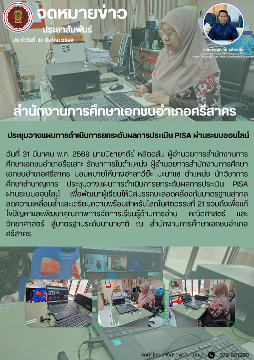 วันที่ 31 มีนาคม พ.ศ. 2569 นายนิซายาดีย์ หลีตอสัน ผู้อำนวยการสำนักงานการศึกษาเอกชนอำเภอรือเสาะ รักษาการในตำแหน่ง ผู้อำนวยการสำนักงานการศึกษาเอกชนอำเภอศรีสาคร มอบหมายให้นางฮาลาวีย๊ะ มะนาแซ ตำเเหน่ง นักวิชาการศึกษาชำนาญการ ประชุมวางแผนการดำเนินการยกระดับผลการประเมิน PISA ผ่านระบบออนไลน์ เพื่อพัฒนาผู้เรียนให้มีสมรรถนะสอดคล้องกับมาตรฐานสากล ลดความเหลื่อมล้ำเเละเตรียมความพร้อมสำหรับโลกในศตวรรษที่ 21 รวมถึงเพื่อเเก้ไขปัญหาเเละพัฒนาคุณภาพการจัดการเรียนรู้ด้านการอ่าน คณิตศาสตร์ เเละวิทยาศาสตร์ สู่มาตรฐานระดับนานาชาติ ณ สำนักงานการศึกษาเอกชนอำเภอศรีสาคร