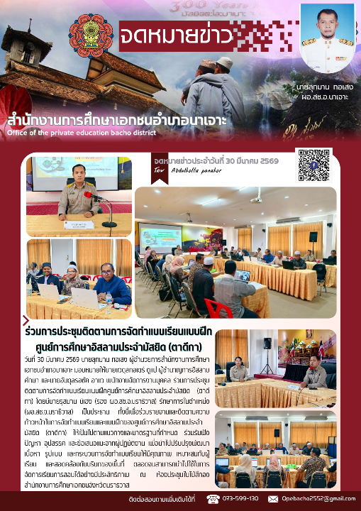 วันที่ 30 มีนาคม 2569 นายลุกมาน กอเสง ผู้อำนวยการสำนักงานการศึกษาเอกชนอำเภอบาเจาะ มอบหมายให้นายแวดุลกอเดร์ ตูแป ผู้ชำนาญการอิสลามศึกษา และนายอับดุลรอซัค อาแว พนักงานจัดการงานบุคคล ร่วมการประชุมติดตามการจัดทำแบบเรียนแบบฝึกศูนย์การศึกษาอิสลามประจำมัสยิด (ตาดีกา) โดยมีนายรุสมาน นิเฮง (รอง ผอ.สช.จ.นราธิวาส) รักษาการในตำแหน่ง (ผอ.สช.จ.นราธิวาส) เป็นประธาน ทั้งนี้เพื่อร่วมรายงานและติดตามความก้าวหน้าในการจัดทำแบบเรียนและแบบฝึกของศูนย์การศึกษาอิสลามประจำมัสยิด (ตาดีกา) ให้เป็นไปตามแนวทางและมาตรฐานที่กำหนด ร่วมรับฟังปัญหา อุปสรรค และข้อเสนอแนะจากผู้ปฏิบัติงาน เพื่อนำไปปรับปรุงพัฒนาเนื้อหา รูปแบบ และกระบวนการจัดทำแบบเรียนให้มีคุณภาพ เหมาะสมกับผู้เรียน และสอดคล้องกับบริบทของพื้นที่ ตลอดจนสามารถนำไปใช้ในการจัดการเรียนการสอนได้อย่างมีประสิทธิภาพ ณ ห้องประชุมใบไม้สีทอง สำนักงานการศึกษาเอกชนจังหวัดนราธิวาส