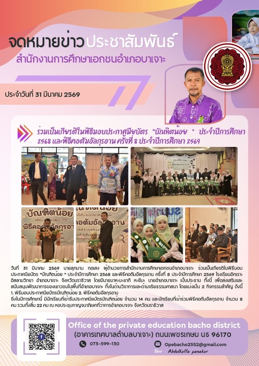 วันที่ 31 มีนาคม 2569 นายลุกมาน กอเสง ผู้อำนวยการสำนักงานการศึกษาเอกชนอำเภอบาเจาะ ร่วมเป็นเกียรติในพิธีมอบประกาศนียบัตร "บัณฑิตน้อย " ประจำปีการศึกษา 2568 และพิธีคอตัมอัลกุรอาน ครั้งที่ 8 ประจำปีการศึกษา 2569 โรงเรียนอิกเราะอิสลามวิทยา อำเภอบาเจาะ จังหวัดนราธิวาส โดยมีนายมาหะมะยากี หะยีมะ นายอำเภอบาเจาะ เป็นประธาน ทั้งนี้ เพื่อส่งเสริมและสนับสนุนพัฒนาการของเยาวชนในพื้นที่อำเภอบาเจาะ ทั้งในด้านวิชาการและด้านจริยธรรมศาสนา โดยแบ่งเป็น 2 กิจกรรมสำคัญ ดังนี้ 1. พิธีมอบประกาศนียบัตรบัณฑิตน้อย เพื่อเป็นการแสดงความยินดีและสร้างความภาคภูมิใจให้แก่เด็กนักเรียนระดับปฐมวัยที่สำเร็จการศึกษา เสริมสร้างขวัญกำลังใจให้เด็กๆ พร้อมที่จะก้าวไปสู่การเรียนในระดับที่สูงขึ้นอย่างมีคุณภาพ 2. พิธีคอตัมอัลกุรอาน เพื่อเป็นการเชิดชูเกียรติและประกาศเกียรติคุณแก่กลุ่มเยาวชนที่ได้มีความมานะอุตสาหะในการศึกษาพระมหาคัมภีร์อัลกุรอานจนจบเล่ม ซึ่งถือเป็นรากฐานสำคัญในการดำเนินชีวิตตามหลัการศาสนาที่ถูกต้อง ซึ่งในปีการศึกษานี้ มีนักเรียนที่เข้ารับประกาศนียบัตรบัณฑิตน้อย จำนวน 14 คน และนักเรียนที่เข้าร่วมพิธีคอตัมอัลกุรอาน จำนวน 8 คน รวมทั้งสิ้น 22 คน ณ หอประชุมกาญจนาภิเษกที่ว่าการอำเภอบาเจาะ จังหวัดนราธิวาส