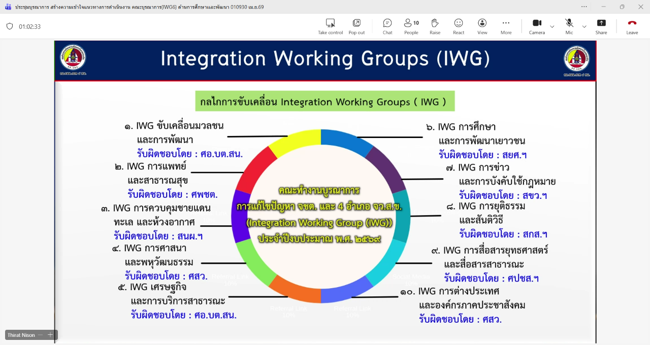 วันที่ 1 เมษายน พ.ศ. 2569 เวลา 09:30 น. นายรุสมาน นิเฮง (รอง ผอ.สช.จ.นราธิวาส) รักษาการในตำแหน่ง (ผอ.สช.จ.นราธิวาส) ร่วมประชุมสร้างความเข้าใจแนวทางการดำเนินงาน คณะทำงานบูรณาการการแก้ไขปัญหา จังหวัดชายแดนใต้ (Integration Working Group (IWG)) ประจำปีงบประมาณ 2569 ผ่านระบบการประชุมออนไลน์ (Microsoft Team Meeting) วัตถุประสงค์เพื่อร่วมวางแผน กำหนดกรอบการดำเนินงาน และขับเคลื่อนการแก้ไขปัญหาในพื้นที่จังหวัดชายแดนภาคใต้ให้สอดคล้องกับสถานการณ์และบริบทของพื้นที่ โดยมี พลตรี อนุชา โนนคู่เขตโขง (ผู้อำนวยการส่วนพัฒนายุทธศาสตร์ กอ.รมน.ภาค 4 สน.) เป็นประธานในการประชุมฯ
