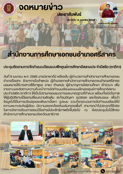 วันที่ 8 เมษายน พ.ศ. 2569 นายนิซายาดีย์ หลีตอสัน ผู้อำนวยการสำนักงานการศึกษาเอกชนอำเภอรือเสาะ รักษาการในตำแหน่ง ผู้อำนวยการสำนักงานการศึกษาเอกชนอำเภอศรีสาคร มอบหมายให้นางสาวสีตีอาซูรอ อาแว ตำแหน่ง ผู้ชำนาญการอิสลามศึกษา เข้าร่วมฯ เพื่อรายงานและติดตามความคืบหน้าการจัดทำแบบเรียนและแบบฝึกของศูนย์การศึกษาอิสลามประจำมัสยิด (ตาดีกา) ให้เป็นไปตามกรอบแนวทางและมาตรฐานที่กำหนด พร้อมทั้งเปิดโอกาสให้ผู้ปฏิบัติงานได้แลกเปลี่ยนความคิดเห็น สะท้อนปัญหา อุปสรรค และข้อเสนอแนะ เพื่อนำข้อมูลไปใช้ในการปรับปรุงและพัฒนาเนื้อหา รูปแบบ รวมถึงกระบวนการจัดทำแบบเรียนให้มีความเหมาะสมกับผู้เรียน มีความสอดคล้องกับบริบทของพื้นที่ สามารถนำไปประยุกต์ใช้จริงในการจัดการเรียนการสอนได้อย่างมีประสิทธิภาพยิ่งขึ้นต่อไป ณ ห้องประชุมใบไม้สีทอง สำนักงานการศึกษาเอกชนจังหวัดนราธิวาส