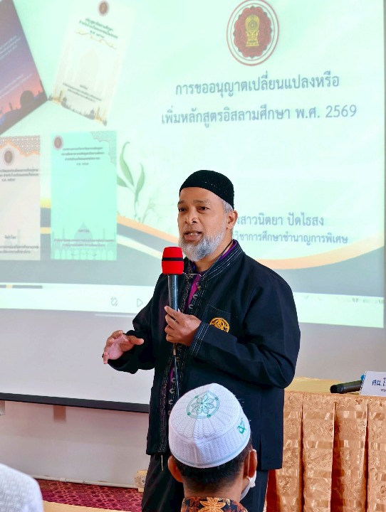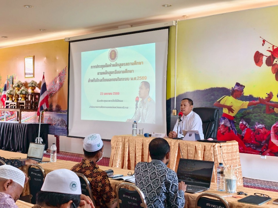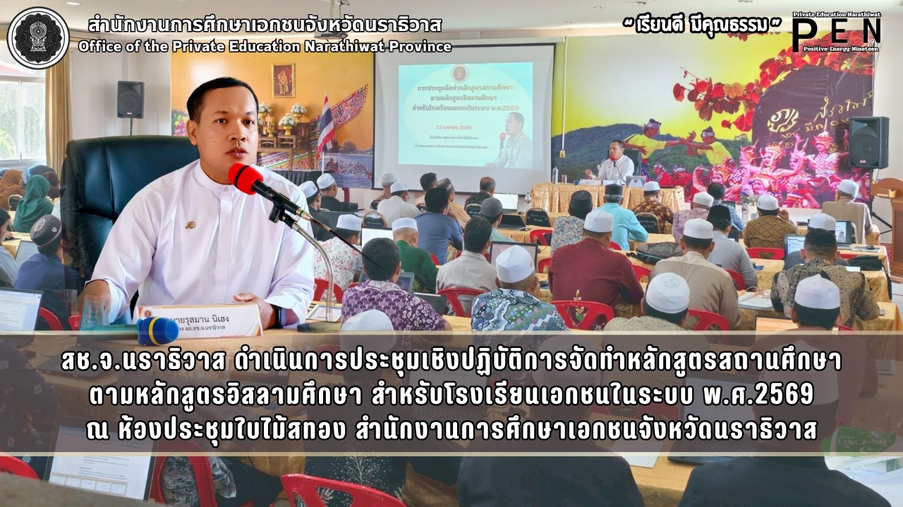 วันที่ 23 เมษายน พ.ศ. 2569 เวลา 09:00 น. นายรุสมาน นิเฮง (รอง ผอ.สช.จ.นราธิวาส) รักษาการในตำแหน่ง (ผอ.สช.จ.นราธิวาส) ประธานเปิดการประชุมเชิงปฏิบัติการจัดทำหลักสูตรสถานศึกษาตามหลักสูตรอิสลามศึกษา สำหรับโรงเรียนเอกชนในระบบ พ.ศ.2569 ณ ห้องประชุมใบไม้สทอง สำนักงานการศึกษาเอกชนจังหวัดนราธิวาส เพื่อชี้แจงแนวทางการนำหลักสูตรอิสลามศึกษา พ.ศ. 2569 ไปใช้แทนหลักสูตรเดิม (พ.ศ. 2546) ให้สถานศึกษาเกิดความเข้าใจที่ถูกต้องและสามารถนำไปปรับใช้ได้อย่างมีประสิทธิภาพ โดยมี ผู้บริหาร/ผู้แทน หัวหน้างานวิชาการ ครูและเจ้าหน้าที่ผู้รับผิดชอบเกี่ยวกับหลักสูตรอิสลามศึกษา เข้าร่วมในการประชุม จำนวนรวมกว่า 120 คน โดยได้รับเกียรติจาก นายโซเฟียน ละมูลอ (ศน.ศธจ.นราธิวาส) ร่วมบรรยายให้ความรู้และแลกเปลี่ยนแนวทางการดำเนินงานร่วมกับผู้เข้าร่วมประชุม