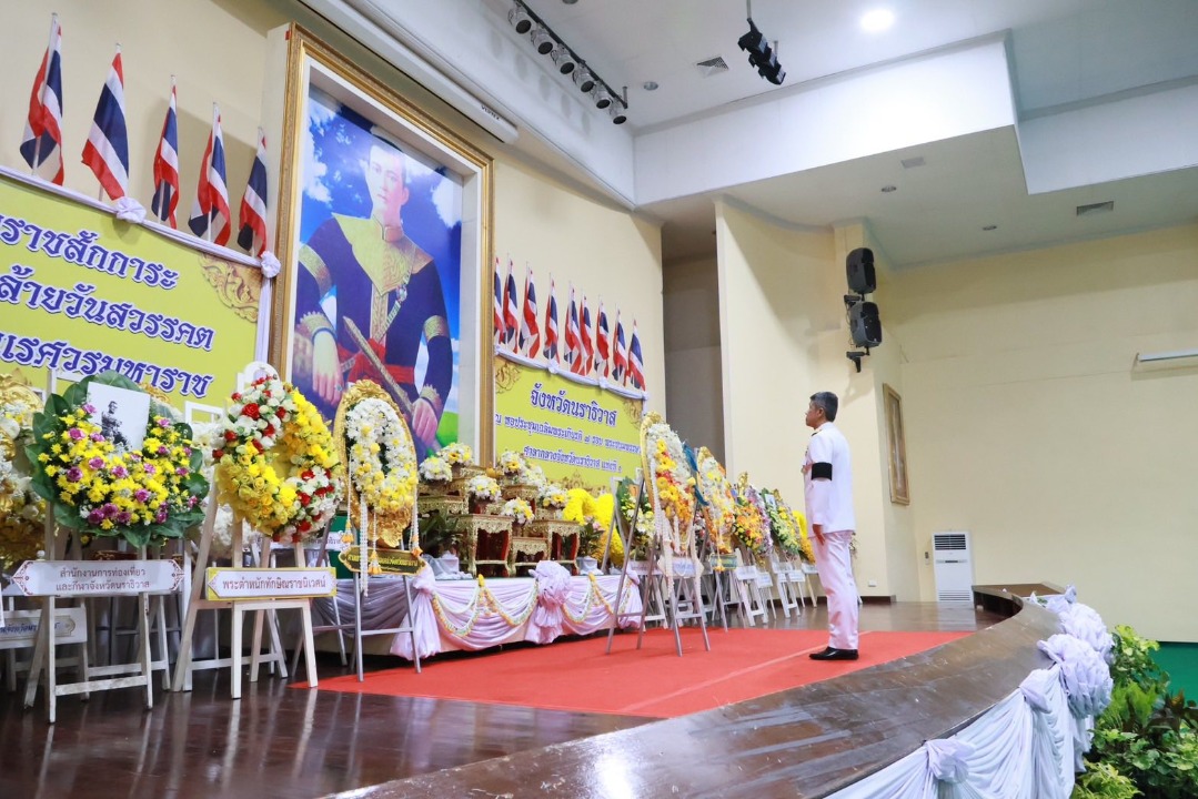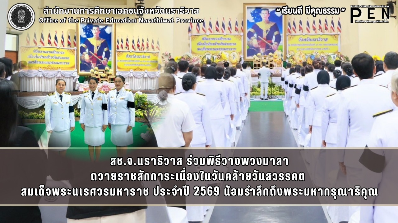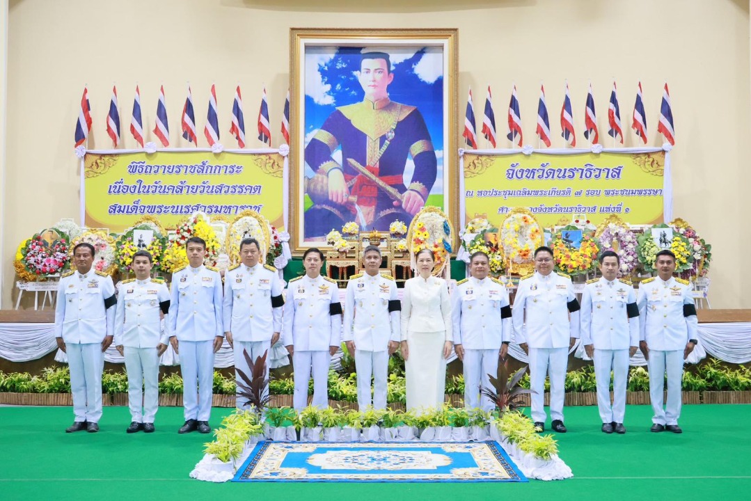 วันที่ 25 เมษายน พ.ศ. 2569 เวลา 09:00 น. นายบุญช่วย หอมยามเย็น (ผู้ว่าราชการจังหวัดนราธิวาส) ประธานในพิธีวางพวงมาลาถวายราชสักการะเนื่องในวันคล้ายวันสวรรคต สมเด็จพระนเรศวรมหาราช ประจำปี 2569 ณ หอประชุมเฉลิมพระเกียรติ 7 รอบพระชนมพรรษา ศาลากลางจังหวัดนราธิวาส แห่งที่ 1 โดย นายรุสมาน นิเฮง (รอง ผอ.สช.จ.นราธิวาส) รักษาการในตำแหน่ง (ผอ.สช.จ.นราธิวาส) มอบหมายให้ นางสาวชนัญชิดา คุณสุทธิ์ (รอง ผอ.สช.จ.นราธิวาส) พร้อมด้วย คณะบุคลากรในสังกัด เข้าร่วมในพิธีฯ เพื่อแสดงความจงรักภักดีและน้อมรำลึกในพระมหากรุณาธิคุณ อันหาที่สุดมิได้ ของสมเด็จพระนเรศวรมหาราช ผู้ทรงมีพระปรีชาสามารถและพระวีรกรรมอันยิ่งใหญ่ในการกอบกู้เอกราชของชาติไทย อีกทั้งเป็นแบบอย่างแห่งความเสียสละและความกล้าหาญแก่พสกนิกรชาวไทยสืบไป