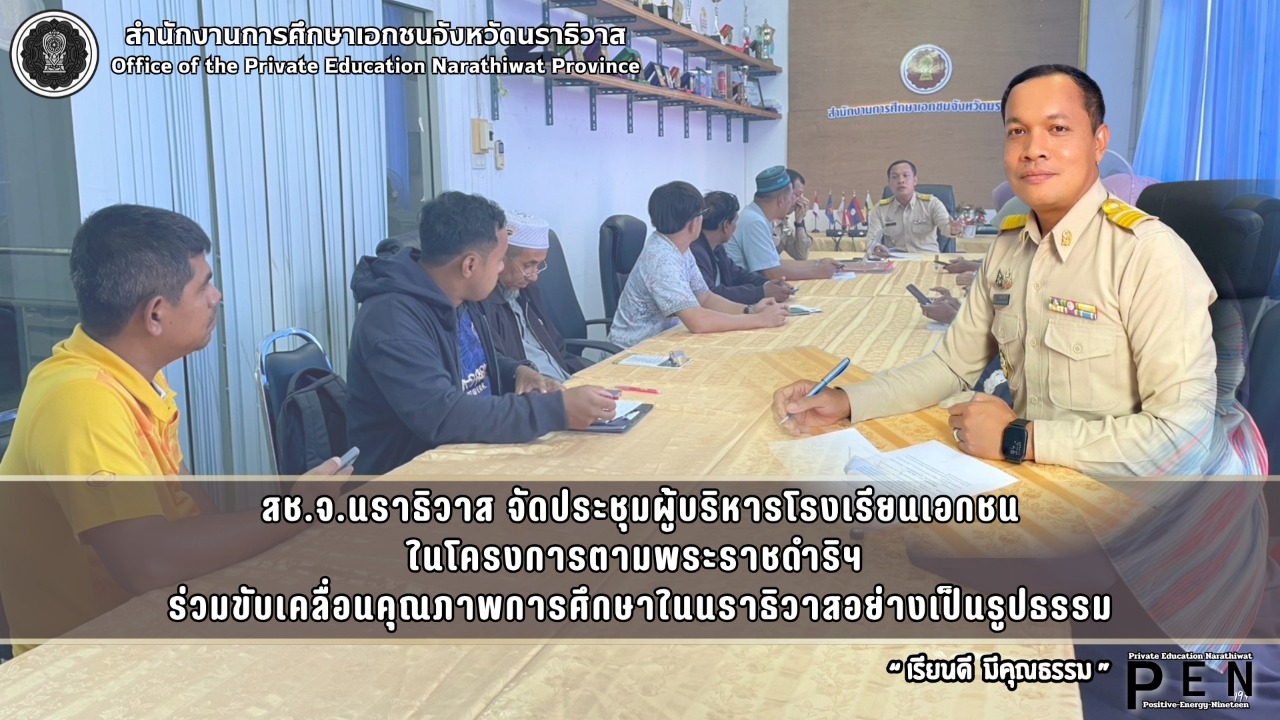 วันที่ 27 เมษายน พ.ศ. 2569 เวลา 13:30 น. นายรุสมาน นิเฮง (รอง ผอ.สช.จ.นราธิวาส) รักษาการในตำแหน่ง (ผอ.สช.จ.นราธิวาส) ประธานการประชุมผู้บริหารโรงเรียนเอกชนในโครงการตามพระราชดำริฯ ณ ห้องประชุมใบไม้สีเงิน (ชั้น 2) สำนักงานการศึกษาเอกชนจังหวัดนราธิวาส อ.เมืองนราธิวาส จ.นราธิวาส เพื่อร่วมทบทวนความก้าวหน้าการของดำเนินงานของสถานศึกษาในโครงการฯ พร้อมทั้งเปิดเวที ให้ผู้บริหารและผู้เกี่ยวข้อง ร่วมแลกเปลี่ยนทัศนะและแนวทางในการพัฒนาการจัดการศึกษา เพื่อยกระดับคุณภาพการบริหารจัดการศึกษาให้เกิดผลสัมฤทธิ์อย่างเป็นรูปธรรม สอดคล้องกับเป้าหมายของโครงการตามพระราชดำริฯ อย่างมีประสิทธิภาพ โดยมี นายเจษฎา ยาลา (นักวิชาการศึกษาชำนาญการ) ผู้บริหารและผู้แทนจากโรงเรียนเอกชนในโครงการตามพระราชดำริฯ ในสังกัดสำนักงานการศึกษาเอกชนจังกวัดนราธิวาส เข้าร่วมการประชุม จำนวนรวม 14 คน