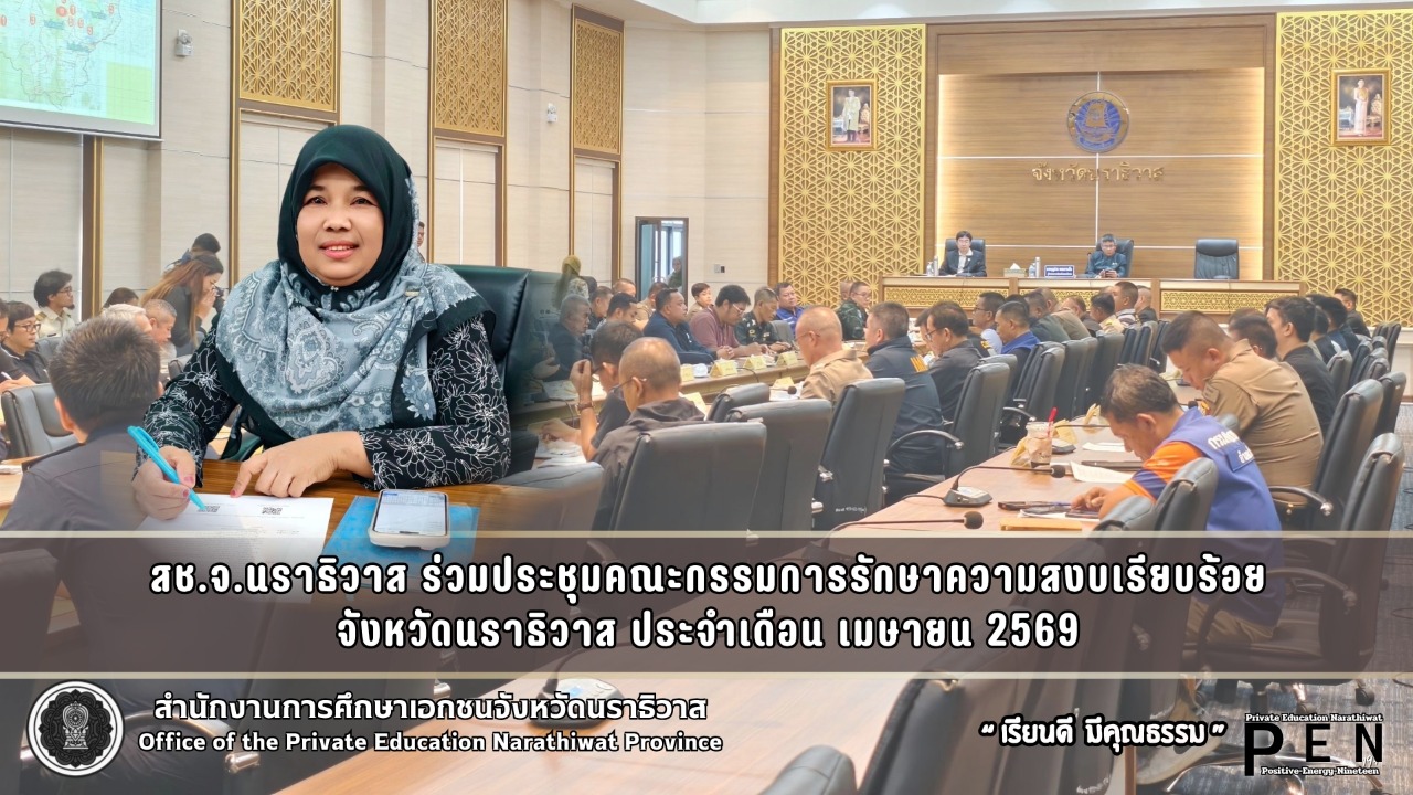 วันที่ 28 เมษายน พ.ศ. 2569 เวลา 13:30 น. นายบุญช่วย หอมยามเย็น (ผู้ว่าราชการจังหวัดนราธิวาส) ประธานในการประชุมคณะกรรมการรักษาความสงบเรียบร้อยจังหวัดนราธิวาส ประจำเดือน เมษายน 2569 ณ ห้องประชุมพระนราภิบาล (ชั้น 4) ศาลากลางจังหวัดนราธิวาส แห่งที่ 2 โดย (รอง ผอ.สช.จ.นราธิวาส) รักษาการในตำแหน่ง (ผอ.สช.จ.นราธิวาส) มอบหมายให้ นางทัศนีย์ เจ๊ะเม๊าะ (นักวิชาการศึกษาชำนาญการ) เข้าร่วมในการประชุมฯ ทั้งนี้เพื่อร่วมรับทราบสถานการณ์ด้านความมั่นคงในพื้นที่ ตลอดจนร่วมพิจารณาแนวทางการป้องกันและแก้ไขปัญหาสำคัญของจังหวัด อาทิ การป้องกันและปราบปรามยาเสพติด การแก้ไขปัญหาความไม่สงบในพื้นที่ รวมถึงการบูรณาการความร่วมมือระหว่างหน่วยงานที่เกี่ยวข้อง เพื่อให้การดำเนินงานด้านความมั่นคงเป็นไปอย่างมีเอกภาพ มีประสิทธิภาพ รวมถึงความปลอดภัยในชีวิตและทรัพย์สินของประชาชนในพื้นที่ได้อย่างยั่งยืน