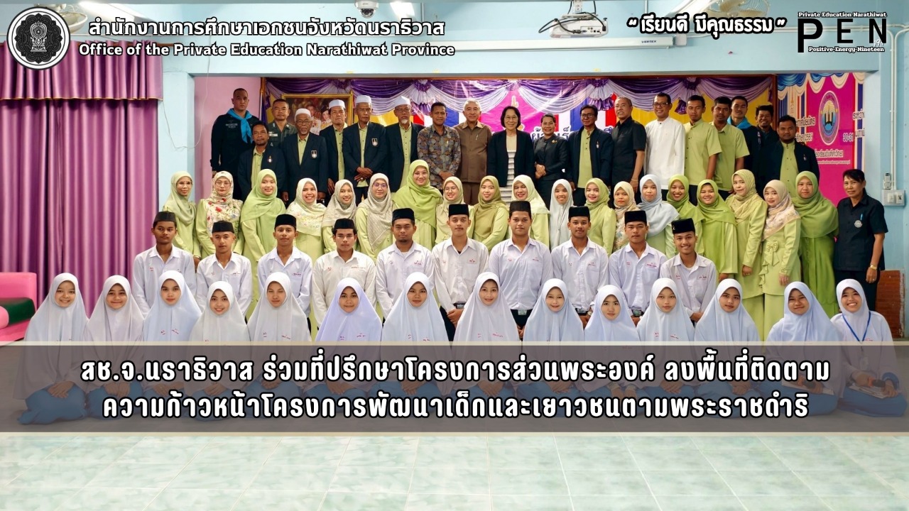 วันที่ 30 เมษายน พ.ศ. 2569 นายรุสมาน นิเฮง (รอง ผอ.สช.จ.นราธิวาส) รักษาการในตำแหน่ง (ผอ.สช.จ.นราธิวาส) ได้มอบหมายให้ นางสาวชนัญชิดา คุณสุทธิ์ (รอง ผอ.สช.จ.นราธิวาส) พร้อมด้วย นายเจษฎา ยาลา (นักวิชาการศึกษาชำนาญการ) ร่วมลงพื้นที่ ติดตามเจ้าหน้าส่วนพระองค์ฯ พันเอกหญิง รศ.ดร.นันทพร วีรวัฒน์ (ที่ปรึกษาโครงการส่วนพระองค์ 905) และ ดร.อภิสิทธิ์ พึ่งพร (ผู้อำนวยการโครงการส่วนพระองค์ 905) เพื่อติดตามความก้าวหน้าโครงการพัฒนาเด็กและเยาวชน ของโรงเรียนเอกชนสอนศาสนาอิสลาม ภายใต้ โครงการตามพระราชดำริ สมเด็จพระกนิษฐาธิราชเจ้า กรมสมเด็จพระเทพรัตนราชสุดาฯ สยามบรมราชกุมารี ณ โรงเรียนอิบตีดาวิทยา (อำเภอรือเสาะ) โรงเรียนดาราวิทยา (อำเภอระแงะ) โรงเรียนจรรยาอิสลาม (อำเภอตากใบ) และโรงเรียนอิสลามบูรพาวิทยา (อำเภอเมืองนราธิวาส) ทั้งนี้เพื่อติดตามความก้าวหน้าในการดำเนินงาน เสริมสร้างคุณภาพการจัดการศึกษา และพัฒนาเด็กและเยาวชนให้สอดคล้องตามแนวพระราชดำริอย่างมีประสิทธิภาพ รูปภาพเพิ่มเติม