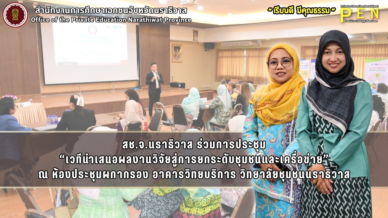 วันที่ 3 กันยายน พ.ศ. 2568 เวลา 13:00 น. นายภิญญา รัตนวรชาติ (ผอ.สช.จ.นราธิวาส) มอบหมายให้ นางสาวซูรียานี อูเซ็ง (พนักงานจัดกิจกรรมการศึกษา) พร้อมด้วย นางอีดาวาตี อาบู (พนักงานจัดกิจกรรมการศึกษา) ร่วมในการประชุม “เวทีนำเสนอผลงานวิจัยสู่การยกระดับชุมชนและเครื่อข่าย” ณ ห้องประชุมผกากรอง อาคารวิทยบริการ วิทยาลัยชุมชนนราธิวาส เพื่อร่วมรับฟังการนำเสนอผลงานวิจัยฯ แลกเปลี่ยนข้อคิดเห็นและประสบการณ์ ต่อข้อเสนอแนะเชิงนโยบายในการประยุกต์ใช้แนวทางการส่งเสริมทักษะสมองส่วนหน้า EF ที่เหมาะสมกับพื้นที่ 3 จังหวัดชายแดนใต้และพื้นที่พิเศษอื่นๆ โดยมี ดร.ชาร์รีฟท์ สือนิ (ศึกษาธิการจังหวัดนราธิวาส) เป็นประธานเปิดการประชุม