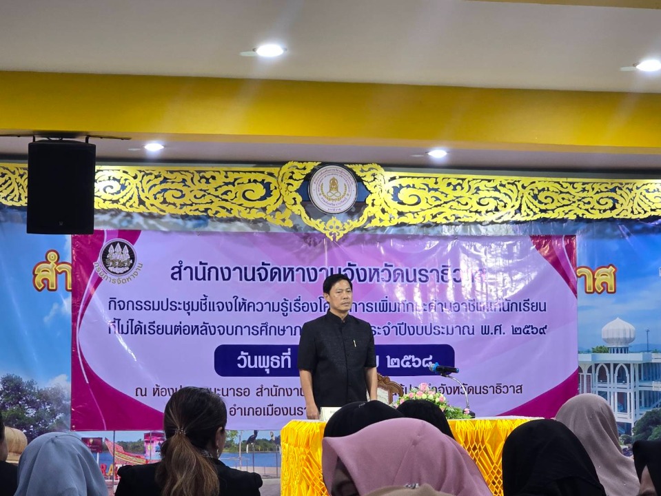 วันที่ 3 ธันวาคม พ.ศ. 2568 เวลา 09:00 น. นายกฤษณนันท์ กำไร (รองผู้ว่าราชการจังหวัดนราธิวาส) ประธานในพิธีเปิดการประชุมชี้แจงให้ความรู้เรื่องโครงการเพิ่มทักษะด้านอาชีพแก่นักเรียนที่ไม่ได้เรียนต่อหลังจบการศึกษาภาคบังคับ ประจำปีงบประมาณ พ.ศ. 2569 ณ ห้องประชุมมะนารอ สำนักงานส่งเสริมการเรียนรู้ประจำจังหวัดนราธิวาส โดย นายภิญญา รัตนวรชาติ (ผอ.สช.จ.นราธิวาส) มอบหมายให้ นางสาวสาลินี ทองแดง (พนักงานการเงินและบัญชี) เข้าร่วมในการประชุม เพื่อร่วมรับทราบถึงแนวทางการดำเนินงานของโครงการ พร้อมกับ ผู้อำนวยการโรงเรียน ครูแนะแนว ของสถานศึกษาที่มีการเรียนการสอนในระดับมัธยมศึกษาปีที่ 3 และผู้บริหารท้องถิ่นในพื้นที่จังหวัดนราธิวาส จำนวนรวมกว่า 170 คน