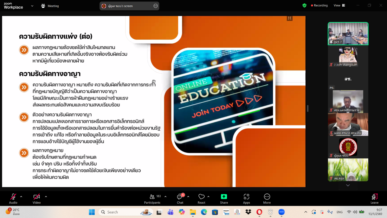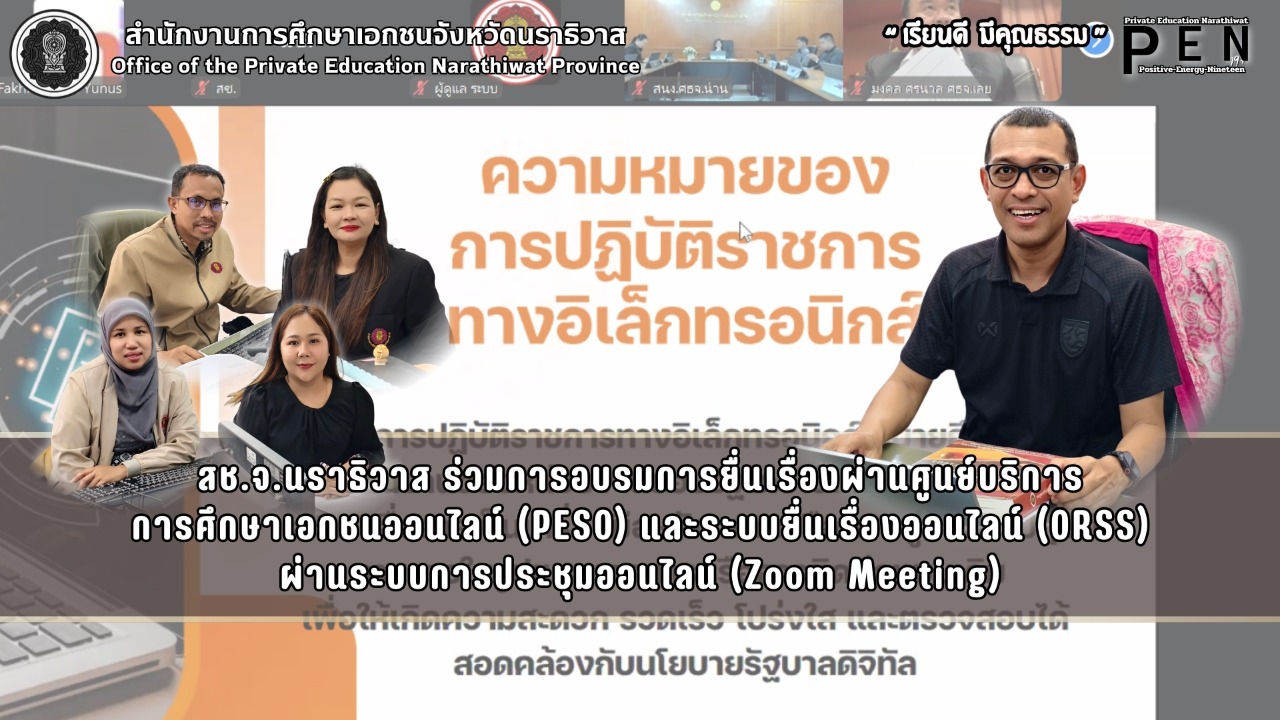 วันที่ 13 มกราคม พ.ศ. 2569 เวลา 09:00 น. นายภิญญา รัตนวรชาติ (ผอ.สช.จ.นราธิวาส) มอบหมายให้ นายเจษฎา ยาลา (นักวิชาการศึกษาชำนาญการ) พร้อมด้วย คณะบุคลากรกลุ่มส่งเสริมการจัดการศึกษา เข้าร่วมการอบรมการยื่นเรื่องผ่านศูนย์บริการการศึกษาเอกชนออนไลน์ (PESO) และระบบยื่นเรื่องออนไลน์ (ORSS) ของสำนักงานคณะกรรมการส่งเสริมการศึกษาเอกชน ผ่านระบบการประชุมออนไลน์ (Zoom Meeting) เพื่อเสริมสร้างความรู้ ความเข้าใจ และพัฒนาศักยภาพในการให้บริการด้านการศึกษาเอกชน รวมถึงเพิ่มประสิทธิภาพการดำเนินงานและการให้บริการอย่างเป็นระบบและทันสมัย โดยในการนี้มี ว่าที่ร้อยตรี ปาพจน์ วิณิชยกุล (ผู้อำนวยการกลุ่มงานทะเบียน) เป็นประธานในการอบรมฯ