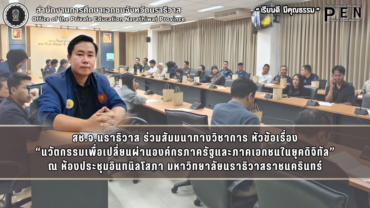 วันที่ 14 มกราคม พ.ศ. 2569 เวลา 09:00 น. นายภิญญา รัตนวรชาติ (ผอ.สช.จ.นราธิวาส) มอบหมายให้ นายณัฏฐภพ โพธิรัชต์ (พนักงานปฏิบัติการด้านคอมพิวเตอร์) ร่วมสัมมนาทางวิชาการ หัวข้อเรื่อง “นวัตกรรมเพื่อเปลี่ยนผ่านองค์กรภาครัฐและภาคเอกชนในยุคดิจิทัล” ณ ห้องประชุมอินทนิลโสภา (ชั้น 5) คณะวิทยาการจัดการ มหาวิทยาลัยนราธิวาสราชนครินทร์ จัดขึ้นโดย คณะวิทยาการจัดการ มหาวิทยาลัยนราธิวาสราชนครินทร์ เพื่อเสริมสร้างความรู้และแลกเปลี่ยนประสบการณ์ด้านการประยุกต์ใช้นวัตกรรมและเทคโนโลยีดิจิทัล สำหรับการพัฒนาและยกระดับประสิทธิภาพในการบริหารจัดการองค์กรให้มีความสอดคล้องกับการเปลี่ยนแปลงในยุคดิจิทัล โดยในการนี้มี ผศ.ดร.บงกช กมลเปรม (คณบดีคณะวิทยาการจัดการ) เป็นประธานเปิดการสัมมนาฯ
